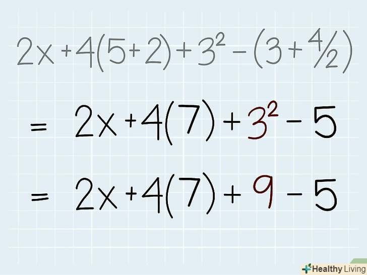 Зведіть в ступінь.вирішивши вирази в дужках, перейдіть до зведення в ступінь (пам'ятайте, що у ступеня є показник ступеня і підстава ступеня). Зведіть відповідний вираз (або число) в ступінь і підставте результат в дане вам вираз.- У нашому прикладі єдиним виразом (числом) у ступені є 32: 32 = 9. В даному вам виразі замість 32 підставте 9 і ви отримаєте: 2x + 4(7) + 9 - 5.