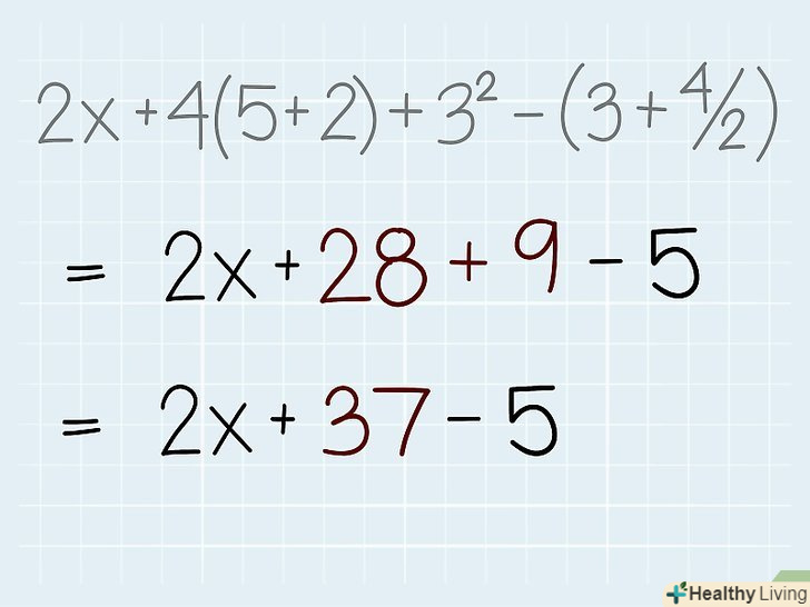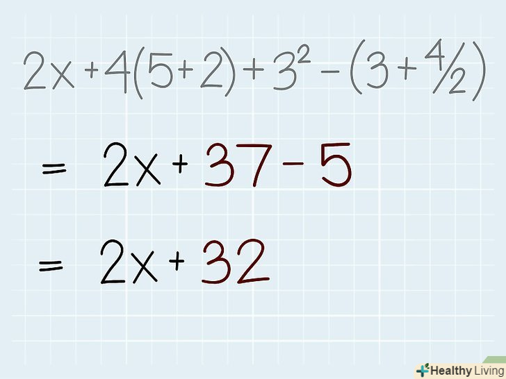 Відніміть.це остання операція в правильному порядку виконання математичних операцій. На цьому етапі ви також можете додавати негативні числа або ж робити це на етапі складання членів – це ніяк не відіб'ється на кінцевому результаті.- У нашому прикладі 2х + 37 - 5 присутній тільки одна операція віднімання: 37 - 5 = 32.