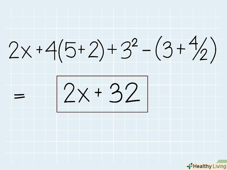 На цьому етапі, виконавши всі математичні операції, ви повинні отримати спрощений вираз.але якщо дане вам вираз містить одну або кілька змінних, то пам'ятайте, що член зі змінною залишиться таким, як є. Рішення (а не спрощення) виразу зі змінною має на увазі знаходження значення цієї змінної. Іноді вирази зі змінною можна спростити, використовуючи спеціальні методи (дивіться наступний розділ).- У нашому прикладі остаточну відповідь: 2х + 32. Ви не зможете скласти два члени, поки не дізнаєтеся значення змінної "х". Дізнавшись значення змінної, ви з легкістю спростите цей двучлен.