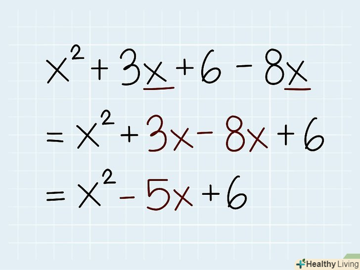 - Розглянемо приклад: x2 + 3x + 6 - 8x. тут подібними членами є 3X і 8x, тому їх можна скласти. Спрощений вираз виглядає так: x2 - 5x + 6.