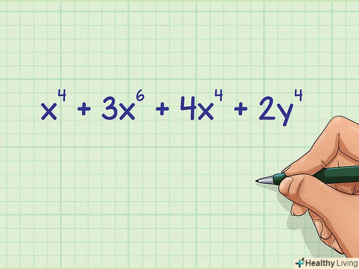 Знайдіть доданки з однаковими підставами і показниками ступеня. підстава має вигляд більшого числа (або змінної) внизу, а показник ступеня стоїть справа вгорі.