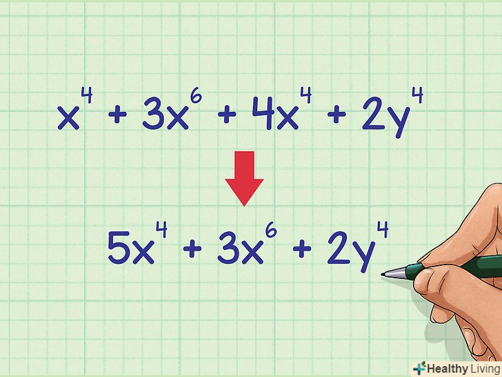 Складіть доданки з однаковими підставами і показниками ступеня.[5] при роботі зі змінними можна складати лише ті члени, у яких однакові підстави і показники ступеня. Тобто однаковими повинні бути обидві ці частини.- Наприклад, якщо дано вираз