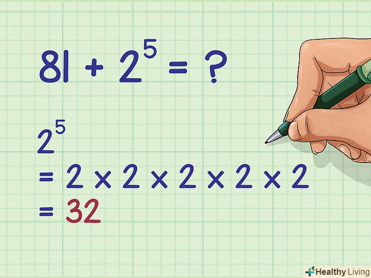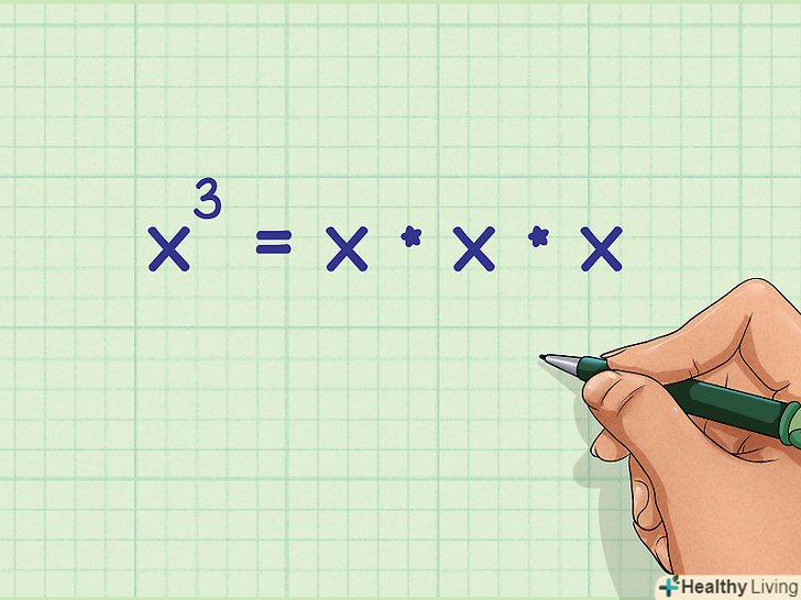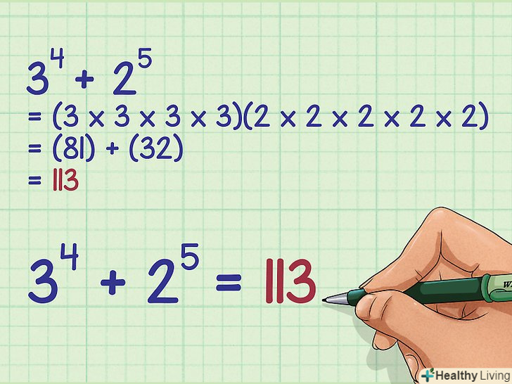 Обчисліть перший степеневий вираз.воно складається з підстави (велике число внизу) і показника (менше за розміром число справа вгорі) ступеня. Показник ступеня визначає, скільки разів слід помножити підставу саме на себе (наприклад,).[2]