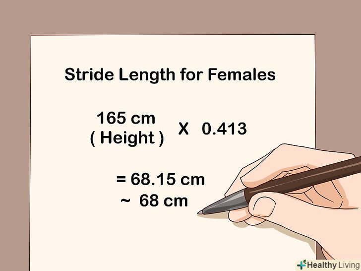 Помножте свій зріст на 0,413, щоб розрахувати довжину кроку для жінок. Визначення довжини кроку по висоті дозволяє швидко знайти приблизне значення, але цей метод не завжди буває точним. Округліть отримане число до найближчого сантиметра.[11]- Якщо ваш зріст становить 165 см, помножте його на 0,413, щоб отримати 68,15 см, і округліть його до 68 см.
