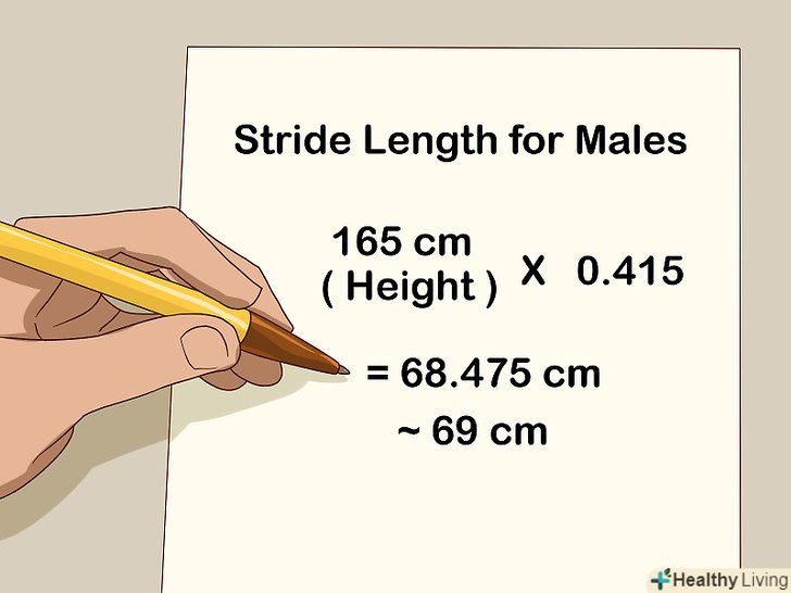 Помножте свій зріст на 0,415, щоб розрахувати довжину кроку для чоловіків.розрахунки для чоловіків трохи відрізняються від розрахунків для жінок, тому використовуйте саме це число, а не 0,413. Обов'язково округліть результат до найближчого цілого сантиметра.[12]- Якщо ваш зріст становить 165 см, помножте його на 0,415, щоб отримати довжину кроку 68,475 см, яка округлюється до 69 см.