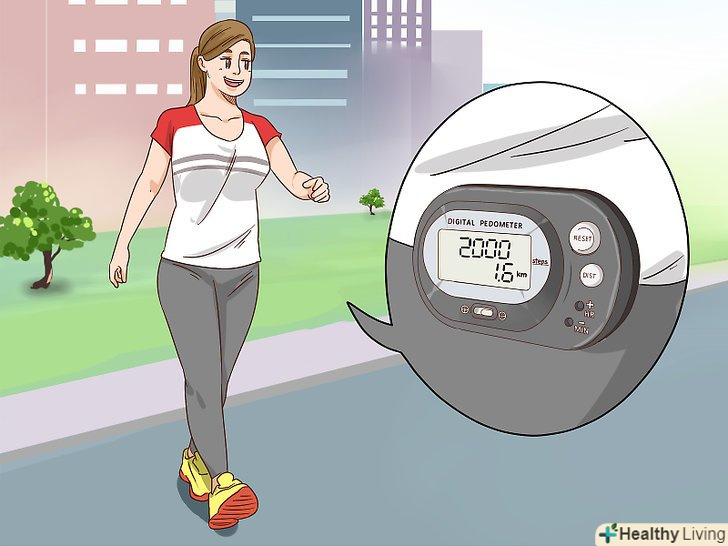 Дістаньте крокомір, щоб порахувати число кроків.крокомір-це невеликий пристрій, що використовується для підрахунку кількості зроблених кроків. Використовуйте крокомір, який пристібається до одягу, або встановіть на телефон спеціальний додаток.[1]- Крокомір можна придбати в більшості спортивних магазинів або через Інтернет.