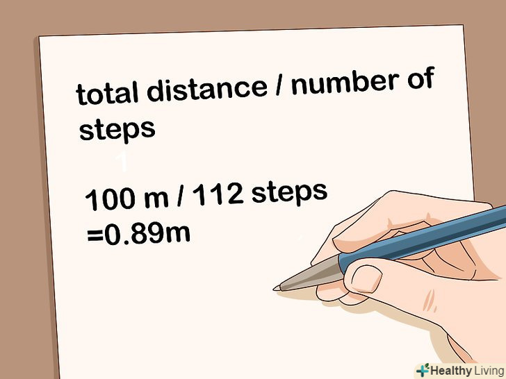 Розділіть відстань на кількість кроків. знаючи загальну кількість зроблених кроків, розділіть відстань, яку ви пройшли або пробігли, на кількість кроків, зазначених на крокомірі. Отримане число і буде вашою довжиною кроку.[3]- Якщо ви пробігли 100 метрів за 112 кроків, то довжина кроку складе 0,89 метра.