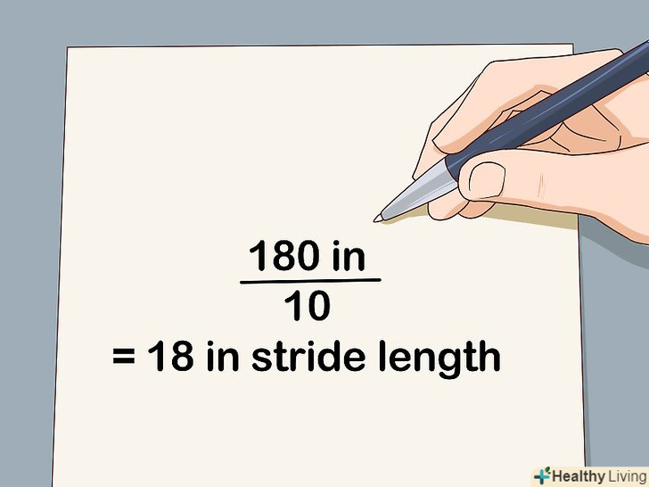 Розділіть відстань в сантиметрах на 10.як тільки ви дізнаєтеся точну відстань, Вам залишиться лише розділити його на кількість кроків. Розділіть відстань на кількість кроків, щоб дізнатися довжину кроку![8]- Наприклад, якщо відстань становить 460 см, то після поділу на 10 Ви отримаєте 46 см. Таким чином, довжина вашого кроку складе 46 см або 0,46 м.