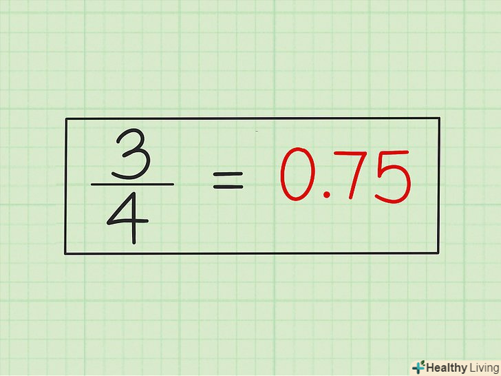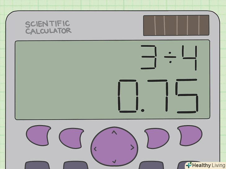 Розділіть чисельник (верхнє число) на знаменник (нижнє число) за допомогою калькулятора.наприклад, розглянемо дріб 3/4. Натисніть "3«, потім натисніть знак ділення»÷«, потім натисніть» 4«, а потім натисніть знак рівності » =" і отримаєте відповідь.