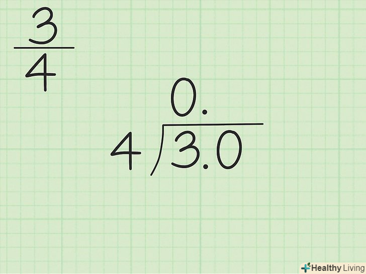 Під дільником напишіть нуль і поставте після нього кому, так як результат ділення чисельника на знаменник звичайного дробу завжди менше 1. написавши під дільником " 0,", поставте біля діленого 0. У нашому прикладі біля 3 напишіть 0, тобто вийде число 30, яке ви будете ділити на 4.