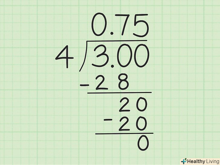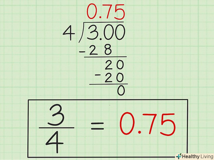 - Розділіть 20 на 4: 20/4 = 5. Напишіть 5 біля "0,7 «і отримаєте»0,75".
