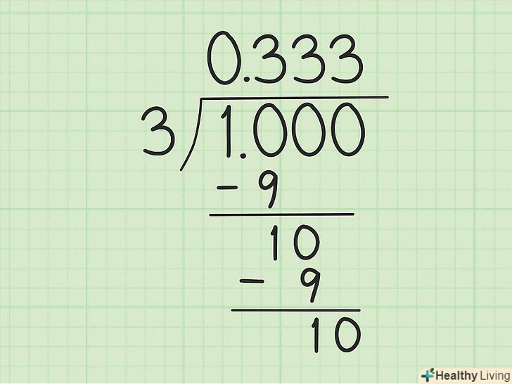 Поділіть в стовпчик.у нашому прикладі розділіть 10 на 3. Ось як це робиться:- Знайдіть число, при множенні якого на 3 Ви отримаєте число, менше і найближче до 10. У нашому прикладі це число 3: 3 х 3 = 9. Напишіть 3 Після " 0,», а 9 напишіть під 10. Відніміть 9 з 10: 10-9 = 1. Напишіть 1 під 9.