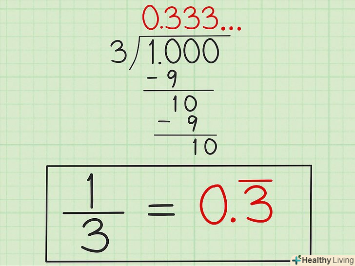 - Якщо ви продовжите ділення в стовпчик, ви помітите, що при діленні 10 на 3 залишок кожен раз дорівнює 1. Ви можете продовжити ділити в стовпчик до нескінченності, але кожен раз у відповіді після десяткової коми ви будете записувати 3 (тобто у відповіді цифра 3 буде повторюватися нескінченне число разів).