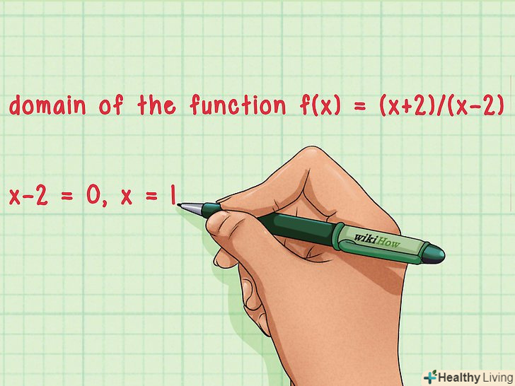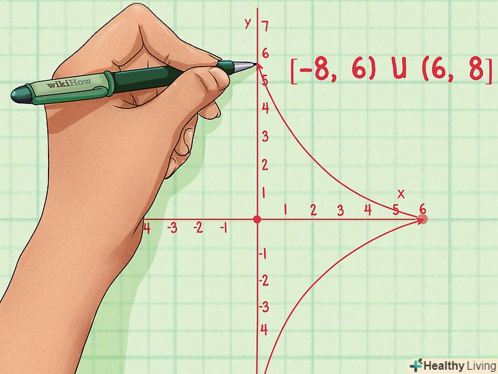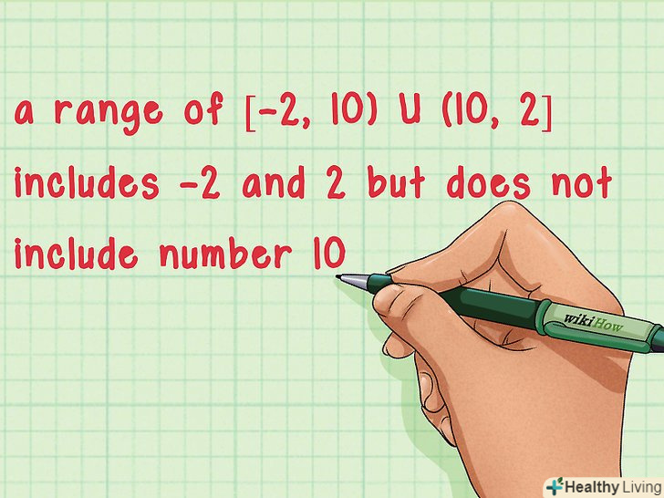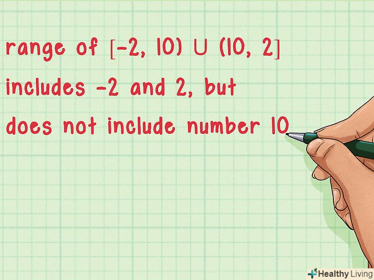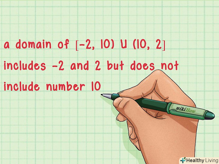 Виберіть відповідний запис для області визначення функції.Область визначення записується в квадратних і / або круглих дужках. Квадратна дужка застосовується в тому випадку, коли значення входить в область визначення функції; якщо значення не входить в область визначення, використовується кругла дужка. Якщо у функції кілька несуміжних областей визначення, між ними ставиться символ "U".[3]- Наприклад, область визначення [-2,10) U (10,2] включає значення -2 і 2, але не включає значення 10.