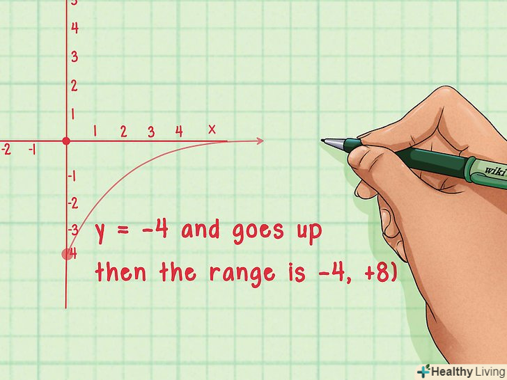 Побудуйте графік функції.у багатьох випадках простіше знайти область значень функції, побудувавши її графік. Областю значень багатьох функцій з корінням є ( - ∞, 0] або [0,+∞), так як вершина параболи, спрямованої вправо або вліво, лежить на осі Х.У цьому випадку область значень включає всі позитивні значення «у», Якщо парабола зростає, або всі негативні значення «у», Якщо парабола убуває. Функції з дробами мають асимптоти, які визначають область значень.[10]- Вершини графіків деяких функцій з корінням лежать вище або нижче осі Х. У цьому випадку область значень визначається координатою» у " вершини параболи. Якщо, наприклад, координата» у " вершини параболи дорівнює -4 (у = -4), а парабола зростає, то область значень дорівнює [-4,+∞).