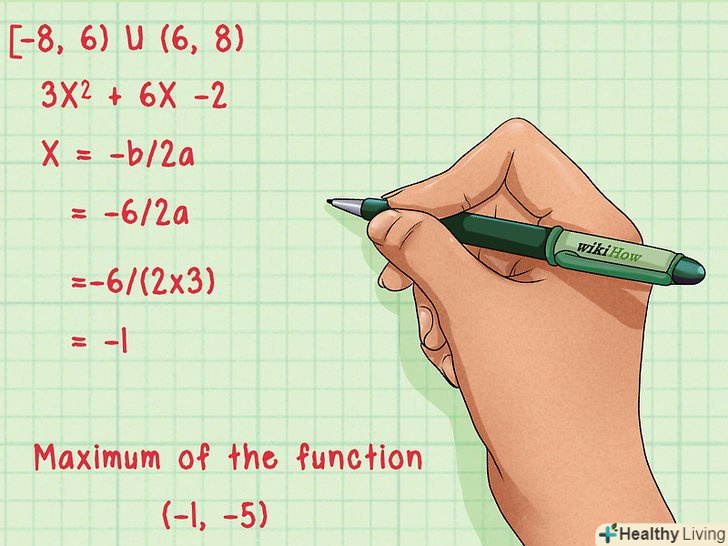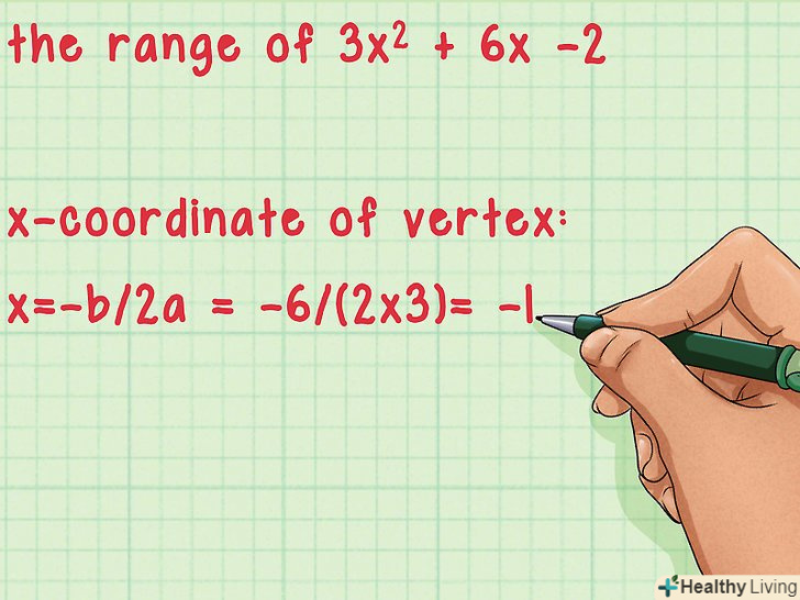 Знайдіть координату» х " вершини графіка функції.у разі квадратичної функції знайдіть координату " х " вершини параболи. Пам'ятайте, що квадратична функція має вигляд: ax2 + bx + C. Для обчислення координати «х» скористайтеся наступним рівнянням: х = -b/2a. Це рівняння є похідною від основної квадратичної функції і описує дотичну, кутовий коефіцієнт якої дорівнює нулю (дотична до вершини параболи паралельна осі Х).[8]- Наприклад, знайдіть область значень функції 3x2 + 6x -2.