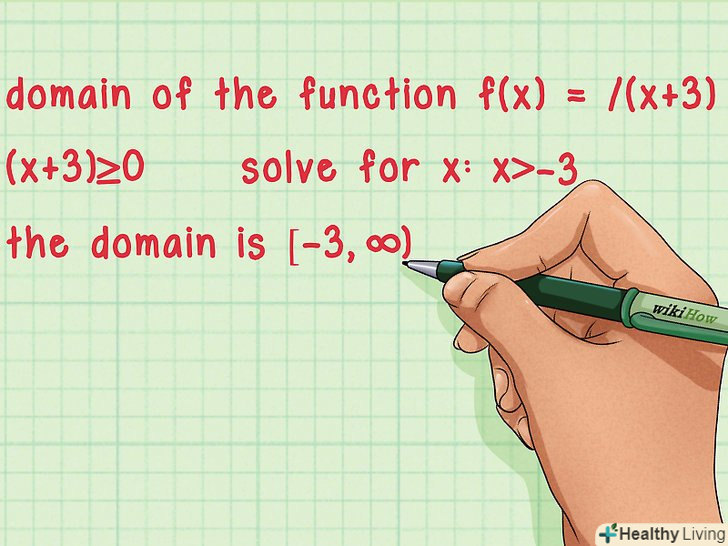 Якщо функція містить квадратний корінь, то підкорене вираз має бути більше або дорівнює нулю.Пам'ятайте, що квадратний корінь з негативних чисел не витягується. Тому будь-яке значення "х", при якому підкорене вираз стає негативним, потрібно виключити з області визначення функції.[6]- Наприклад, знайдіть область визначення функції f(x) = √(x + 3).