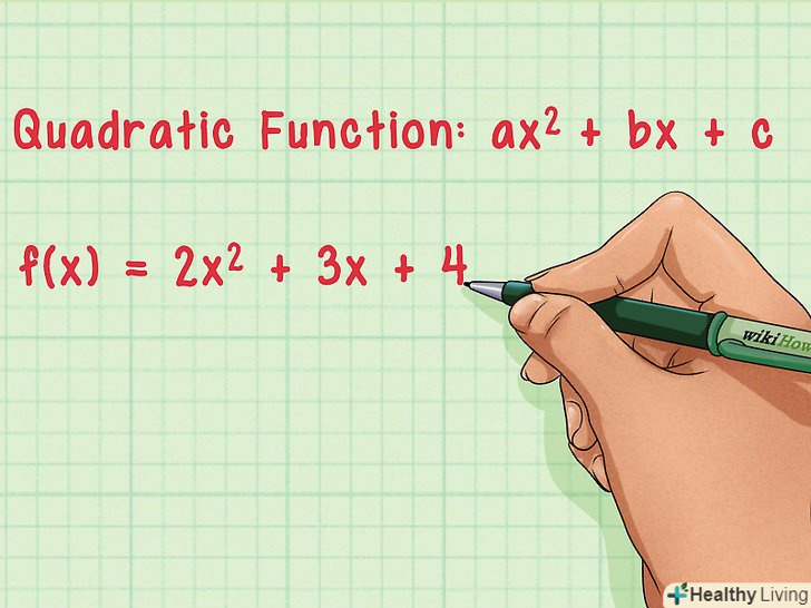 Визначте тип даної вам функції. областю значень функції є всі допустимі значення "х «(відкладаються по горизонтальній осі), яким відповідають допустимі значення»у". Функція може бути квадратичною або містити дроби або коріння. Для знаходження області визначення функції спочатку необхідно визначити тип функції.- Квадратична функція має вигляд: ax2 + bx + c:[2] f(x) = 2x2 + 3x + 4