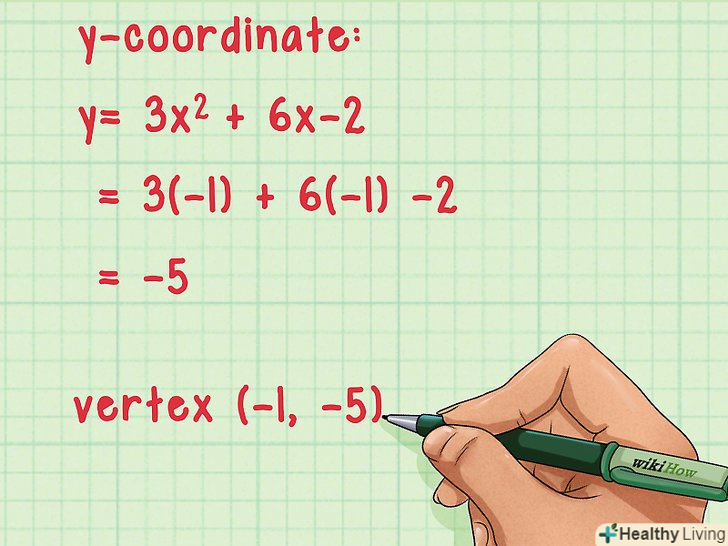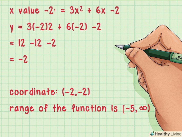Знайдіть координату» у " вершини графіка функції.для цього в функцію підставте знайдену координату "х". Шукана координата " у " являє собою граничне значення області значень функції.- Обчисліть координату «у»: y = 3x2 + 6x – 2 = 3(-1)2 + 6(-1) -2 = -5