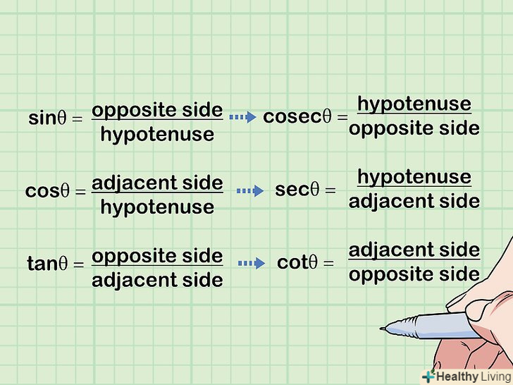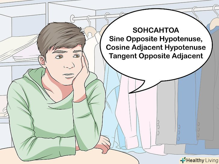 Запам'ятайте, які сторони ділити, щоб обчислювати значення тригонометричних функцій. це можна зробити, наприклад, так:» синус навпроти гіпотенуза, косинус біля гіпотенуза, тангенс навпроти біля«, де» навпаки « — це протилежний катет,» біля " — прилеглий катет.[10]- Ще раз запам'ятайте: sin = (протилежний катет) / гіпотенуза; cos = (прилеглий катет)/гіпотенуза; tg = (протилежний катет)/(прилеглий катет).