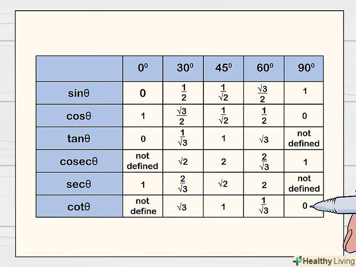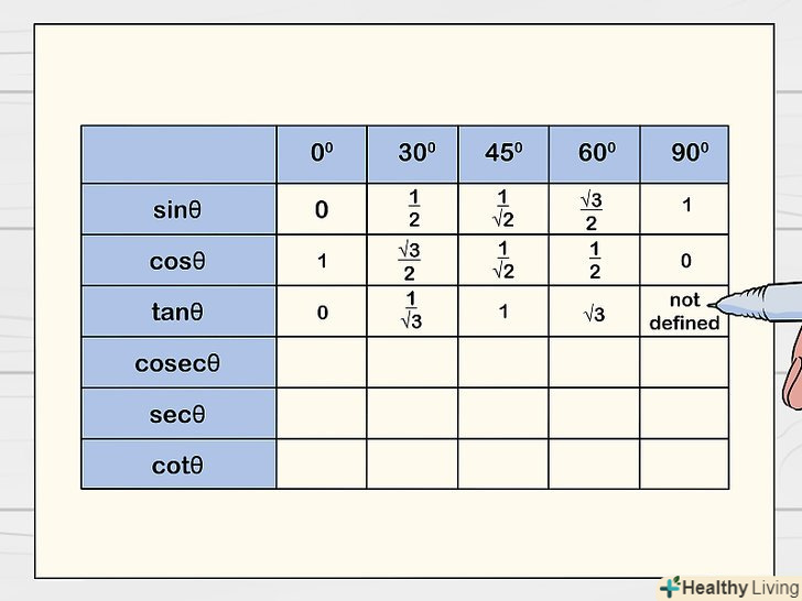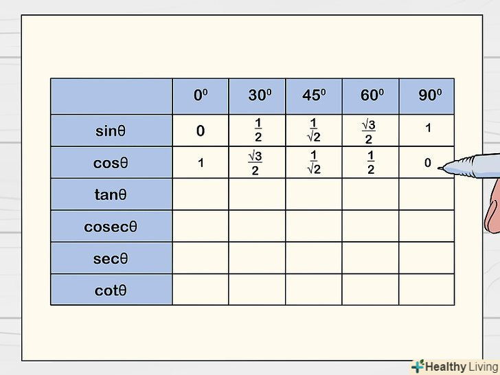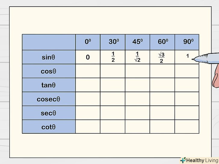 Заповніть порожні клітинки рядка "sin".для цього скористайтеся виразом √x / 2. Замість " x " підставляйте величини кутів, які вказані в першому стовпці таблиці. Використовуйте цей вираз, щоб обчислити значення синуса для кутів 0°, 30°, 45°, 60° і 90°; знайдені значення запишіть в таблицю.[2]- Наприклад, щоб заповнити першу комірку (sin 0°) рядка "sin«, у вираз √x/2 замість» x" підставте 0. Ви отримаєте: √0/2 = 0/2 = 0.