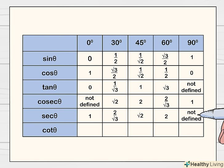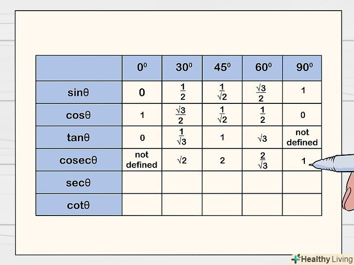 Розділіть 1 на значення рядка "sin«, щоб заповнити рядок»cosec".це можна зробити, оскільки cosec = 1 / sin. Наприклад, sin 30° = 1/2, тому cosec 30° = 1/(1/2) = 2.[5]- Отже, комірки рядка "cosec" заповняться наступним чином:-; 2; √2; 2/√3; 1.