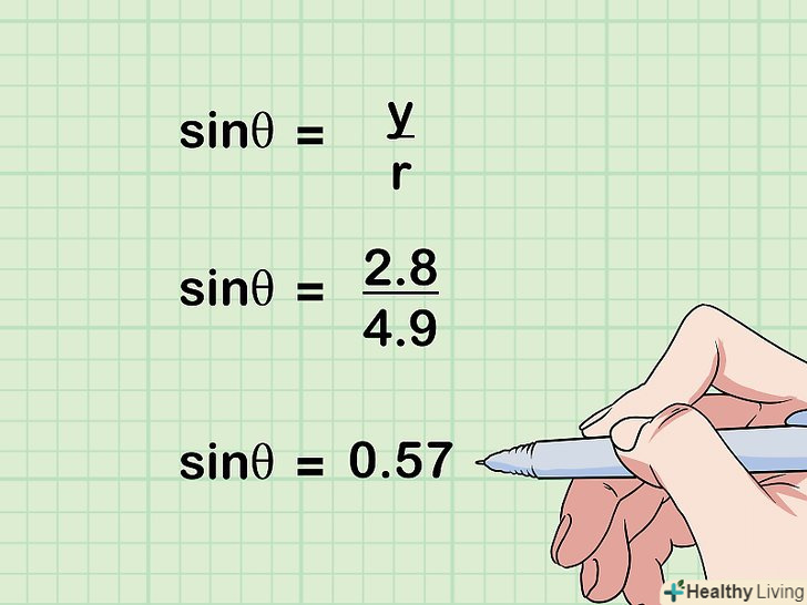- Наприклад, щоб обчислити sin 35°, розділіть довжину протилежного катета на гіпотенузу. Якщо протилежний катет дорівнює 2,8, а гіпотенуза дорівнює 4,9, sin 35° = 2,8/4,9 = 0,57.