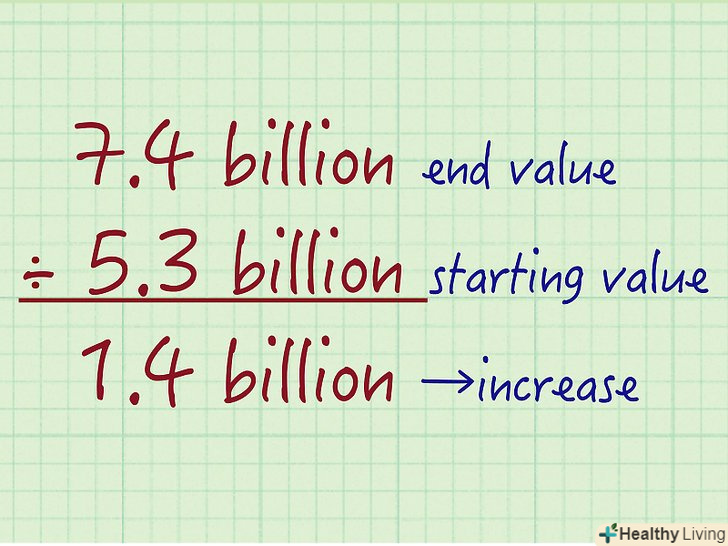 Розділіть кінцеве значення на початкове значення.так ви обчислите, у скільки разів кінцеве значення більше початкового.[2]- 7,4 мільярда ÷ 5,3 мільярда ≈1,4.