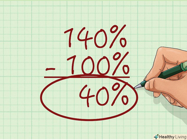 З отриманого результату відніміть 100. у нашому прикладі 100 % — це початкове значення (у відсотках). Якщо з отриманого результату відняти 100, ви знайдете зростання початкової величини (у відсотках).- 140 % - 100 % =40 %. Таким чином, чисельність населення зросла на 40 %.