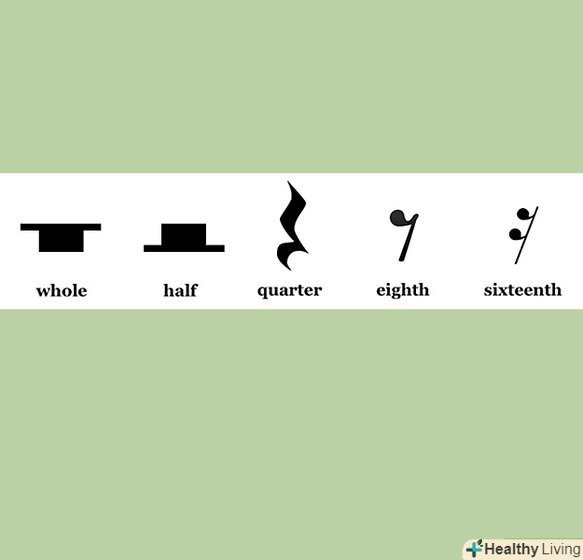 - Навчіться розпізнавати типи нот.є кілька загальних типів нот, які включають різні частини. Є також Знаки паузи, які вказують період часу при відсутності звуку. Ось список найбільш поширених нот:[9]