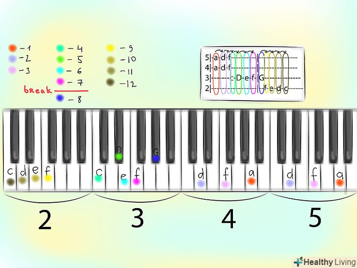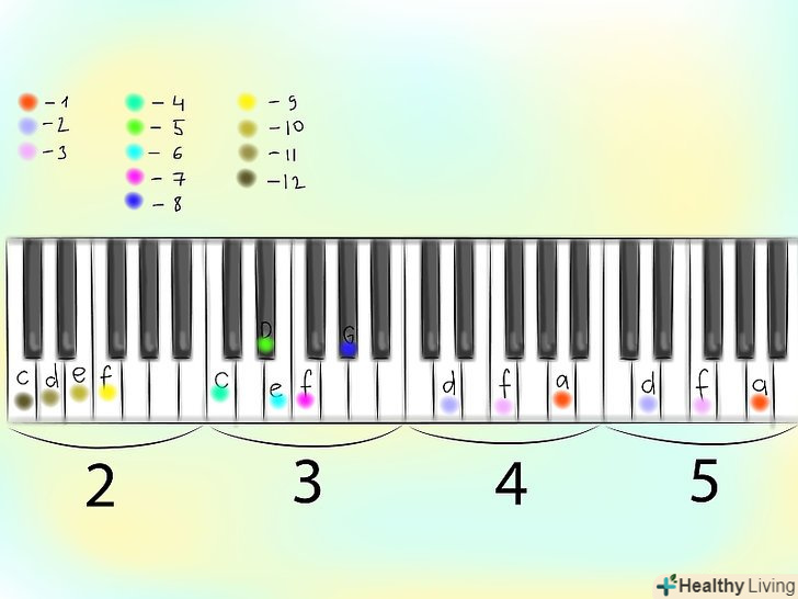 Ви вже напевно здогадалися, що кожна буква відповідає ноті гами. Маленькі букви зазвичай позначають білі клавіші, великі-чорні. Наприклад, С - це до-дієз (чорна клавіша), а с - просто до (Біла клавіша). Ноти слід грати в октаві, що відповідає номеру лінії. Наприклад, ноти на лінії 4 з прикладу вище слід грати в четвертій октаві.- Для простоти фіксації і для того, щоб уникнути плутанини між знаком бемоля і маленькою буквою b, в табулатурах не використовуються бемолі. Щоб записати звук з бемолем, використовується його аналог з дієзом: ре-бемоль записується як до-дієз.