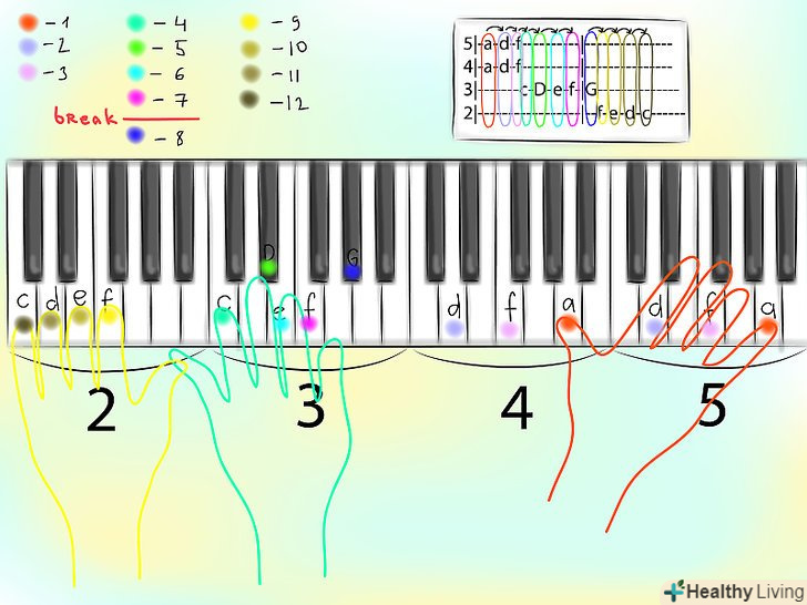 Знайдіть ноти, відштовхуючись від номера октави. ви помітите, що на лініях розташовуються літери від A до G, як тут:5|-a-d-f------------------------