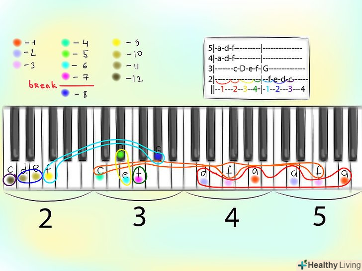 Розбийте клавіатуру на октави, відповідні лініям табів.зазвичай у фортепіанній табулатурі використовуються горизонтальні лінії, підписані цифрами з лівого боку. Наприклад:5|------------------------------