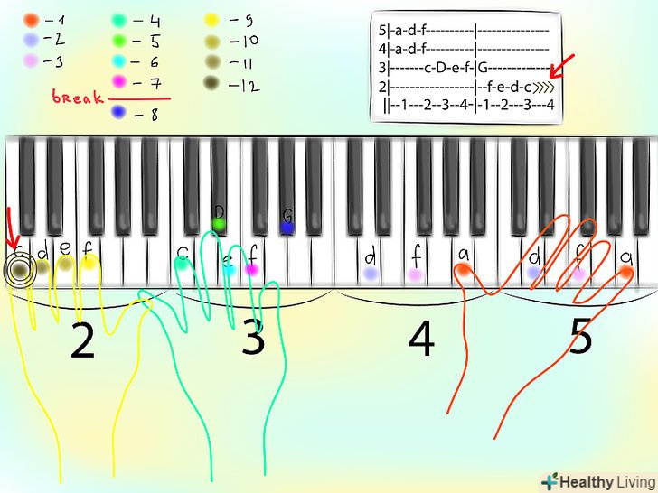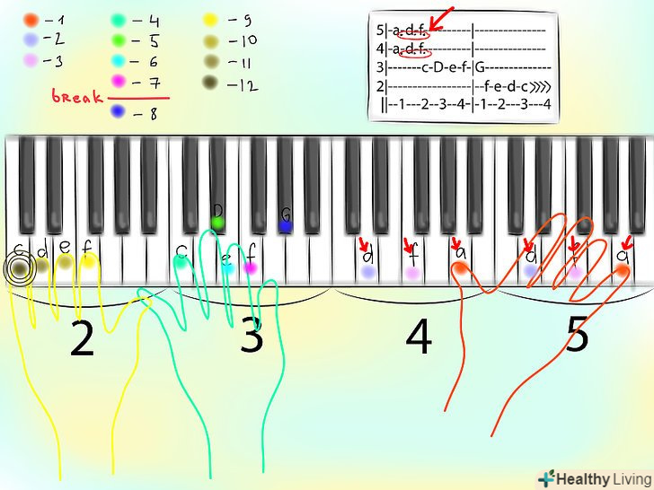 хоча така схема далека від звичної схеми з білих і чорних клавіш, в табах видно різні ділянки клавіатури. Цифра зліва позначає номер октави, в якій беруться ноти. У фортепіанних табах октави відраховуються від ноти до. Починаючи з лівої частини клавіатури, Перша до відзначає початок першої октави, друга до-початок другої октави і так далі.- Наприклад, на схемі, наведеній вище, лінії являють собою п'яту, четверту, третю, і другу октави, починаючи від першого до зліва. не завжди в табулатуру включаються всі октави-іноді в них залишають тільки ті октави, в яких беруться ноти.