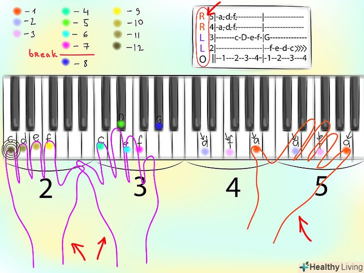У лівій частині табів пошукайте букви, що позначають, якою рукою потрібно грати, - лівої або правої.зазвичай високі ноти беруться правою рукою, а низькі - лівою, тому можна сміливо вважати, що найвищі ноти в табах слід грати правою рукою, а низькі - лівою. Однак іноді в табах вказується, які саме ноти слід взяти кожною рукою. У цих випадках зліва будуть стоять літери " П "- права (або" R " - англ. right) або" Л "- ліва (або" L " - англ. left). Наприклад:R 5|-a. - d. - f.------|---------------у цьому випадку ноти в четвертій і п'ятій октаві потрібно взяти правою рукою, а в другій і третій-лівою.
