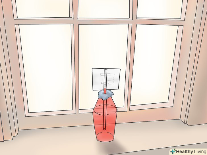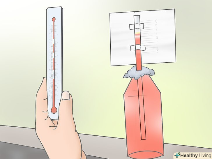Візьміть стандартний термометр.помістіть споруджений вами термометр в приміщення і почекайте, поки рівень рідини в його трубці перестане змінюватися. Піднесіть стандартний спиртовий термометр до трубки вашого саморобного термометра і порівняйте їх показання.- Калібрування саморобного термометра важлива в тому випадку, якщо ви хочете вимірювати їм дійсну температуру, а не просто величину температурних змін. Якщо ви не відкалібруєте і не проградуіруете свій термометр, то за його показаннями не зможете визначити температуру, а будете в змозі лише сказати, потепліло або похолодало.