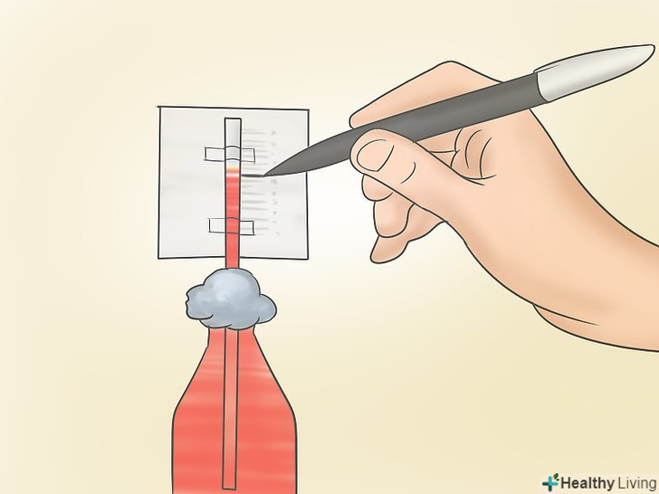 Повторіть вимірювання в середовищах з різною температурою.Проградуювавши термометр, знову помістіть його в різні температурні умови. При кожному вимірюванні температури дочекайтеся, поки стовпчик рідини не припинить переміщатися в трубці. Відзначайте кожне виміряне значення на смужці паперу, прикріпленої до трубки.- Виміряйте якомога більше різних температурних величин. Чим більше значень температури ви завдасте на шкалу вашого термометра, тим точніше будуть його показання при вимірах.