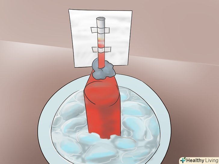 Помістіть термометр в ємність з крижаною водою.наповніть невелику миску холодною водою і покладіть в неї трохи льоду. Зачекайте, поки вода охолоне, потім обережно помістіть пляшку термометра в цю миску. Переконайтеся, що рівень рідини в трубці термометра добре видно.- При приміщенні в холодну воду рівень рідини в трубці термометра повинен знизитися.