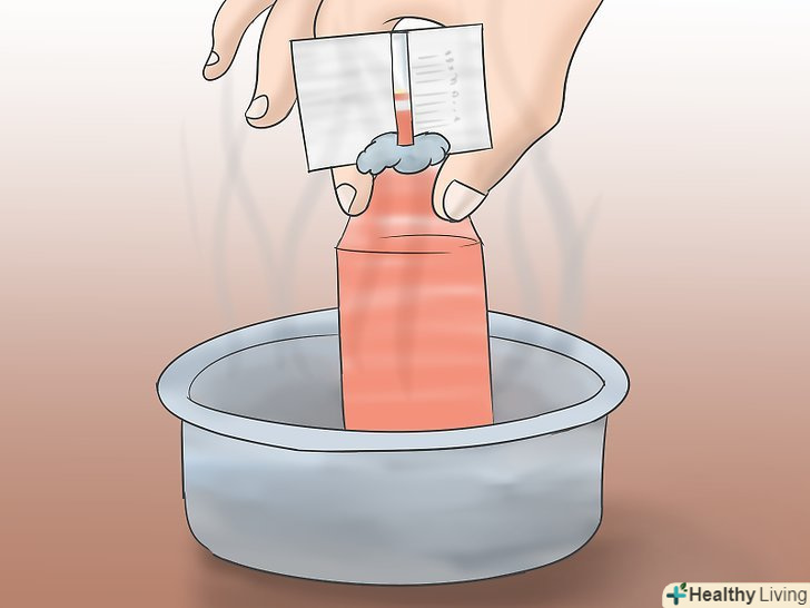 Помістіть термометр в ємність з гарячою водою.наберіть гарячу воду з крана або підігрійте її на плиті, не доводячи до кипіння. Обережно опустіть термометр в гарячу воду, спостерігаючи за рівнем рідини в його трубці.- Врахуйте, що слід почекати, поки рідина в пляшці термометра прогріється до кімнатної температури після того, як ви вийняли пляшку з крижаної води. Не опускайте її в гарячу воду відразу після того, як дістали з крижаної, оскільки при такому різкому перепаді температур пляшка може тріснути, особливо якщо вона скляна.