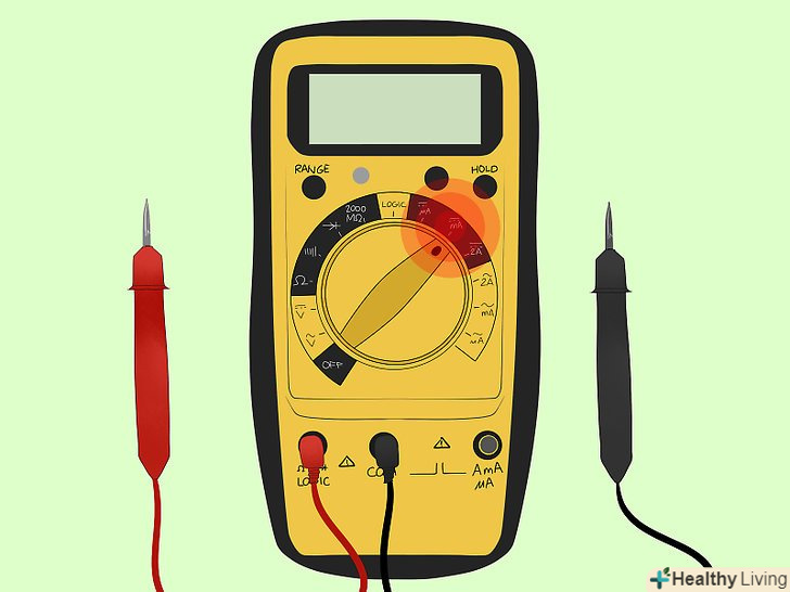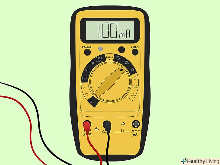 Виставте на шкалі приладу такий діапазон, щоб його максимальне значення перевищувало той струм, який ви збираєтеся виміряти.після того як ви оціните максимальні струми, які очікуєте отримати, знайдіть на мультиметрі перемикач і виставте його трохи вище цього значення. При бажанні можна про всяк випадок виставити максимальний діапазон, однак якщо вимірюваний струм виявиться занадто низьким, ви не отримаєте результат. В цьому випадку доведеться зменшити діапазон і знову виміряти силу струму.[6]- Якщо ви виставите більш високе значення сили струму, ніж розраховуєте виміряти, то тим самим збережіть запобіжники, які можуть згоріти в тому випадку, якщо струм виявиться вище, ніж ви очікували. Якщо струм виявиться значно більше, ніж виставлено на мультиметрі, прилад може вийти з ладу.