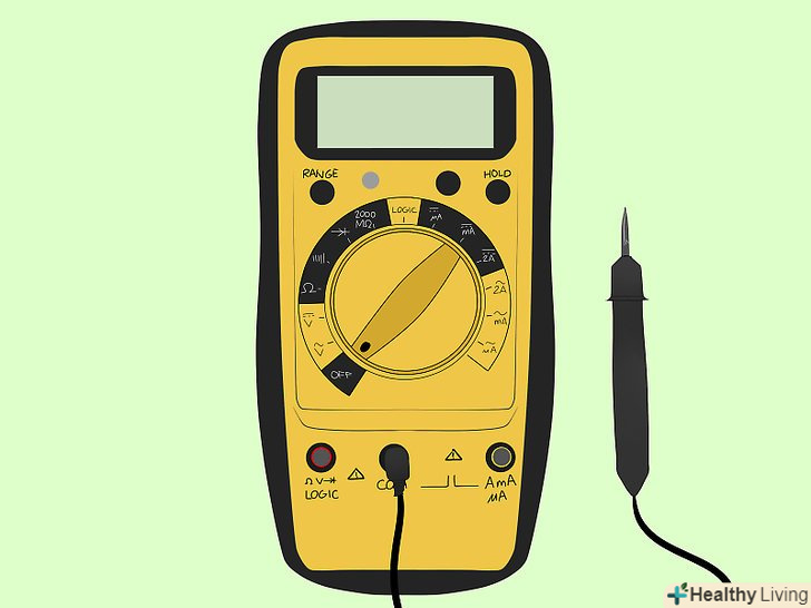 Вставте чорний дріт у гніздо «COM» мультиметра.до мультиметра додаються два дроти, червоний і чорний, на одному кінці яких щуп або затиск, а на другому — роз'єм. Роз'єм вставляється у відповідне гніздо мультиметра. Чорний дріт відповідає негативному полюсу, його завжди слід вставляти в гніздо»COM".[3]- Мітка " COM "означає" common» ("загальний" по-англійськи). Якщо ви не знайдете гнізда з міткою «COM», можливо, замість неї воно позначено знаком «-».