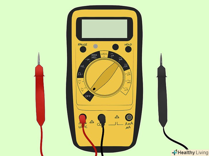 Вставте червоний дріт у гніздо «а".у мультиметрі може бути кілька гнізд, куди можна підключити червоний провід, в залежності від його конструкції і того, що ви хочете виміряти. Гніздо " а " призначене для вимірювання сили струму.[4]- На мультиметрі може бути два гнізда з буквою «а»: просто «а» (або «10а») і "мА". Гніздо "а» або «10а» розраховане на вимірювання сили струму до 10 ампер, а гніздо" мА " дозволяє виміряти менші струми приблизно до 300 міліампер. Якщо ви не знаєте, яке гніздо використовувати, Виберіть більший діапазон, тобто "А» або "10а", щоб не перевантажити прилад.