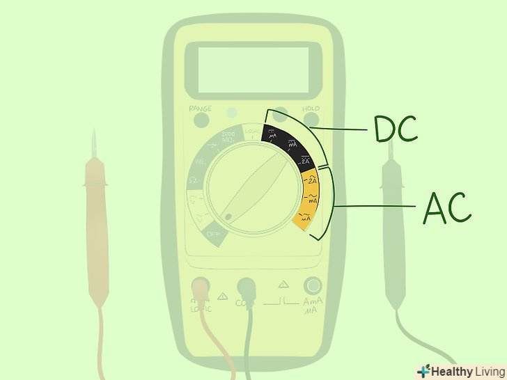 Виберіть на мультиметрі змінний (AC) або постійний (DC) Струм.якщо мультиметр не призначений для роботи тільки зі змінним або постійним струмом, необхідно вибрати, з яким струмом ви маєте справу. Якщо ви сумніваєтеся, перевірте заводську табличку на джерелі живлення.[5]- Змінний струм (AC) зазвичай використовується в побутових приладах і електромоторах, в той час як на постійному струмі (DC) зазвичай працюють ті мотори і пристрої, які живляться від батарей і акумуляторів.
