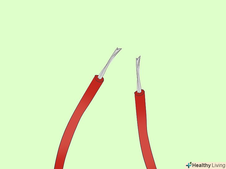 При необхідності зачистіть кінці проводів.потрібно буде обмотати навколо щупів мультиметра трохи дроту, або мати досить великі ділянки оголеного проводу, щоб надійно закріпити на них затискачі приладу. Якщо дріт покрита ізоляцією до самих кінчиків, стисніть провід кусачками приблизно в 2-3 сантиметрах від кінця, обріжте гумову ізоляцію і стягніть її з дроту.[9]- Якщо ви випадково зачепите кусачками провід, відріжте його до кінця і спробуйте ще раз.
