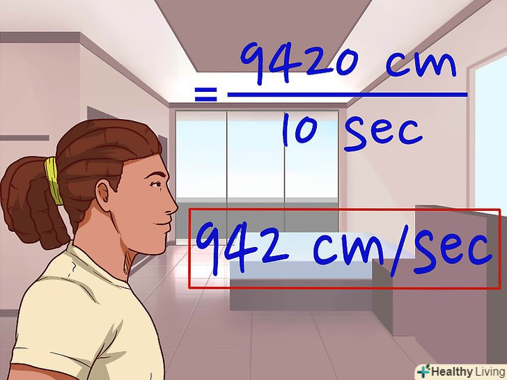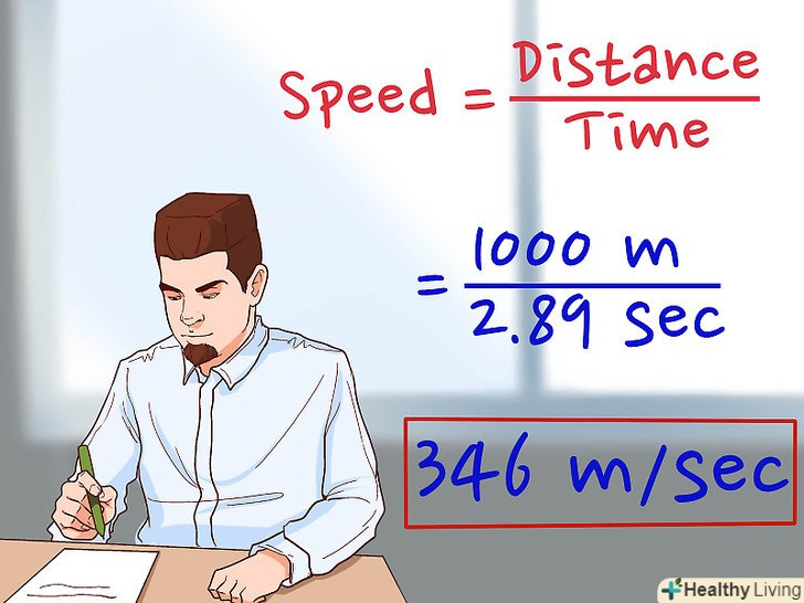 Поділіть пройдену звуком відстань на час, за який ви зробили 11 ударів в долоні.в результаті ви отримаєте швидкість звуку, з якою він долав відстань від ваших долонь до стіни, а потім назад до ваших вух.- Припустимо, для 11 ударів знадобилося 2,89 секунд. Щоб знайти швидкість звуку, треба взяти відстань, тобто 1000 метрів, і поділити його на цей час. В результаті у вас вийде 346 м / с.