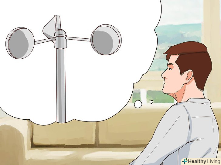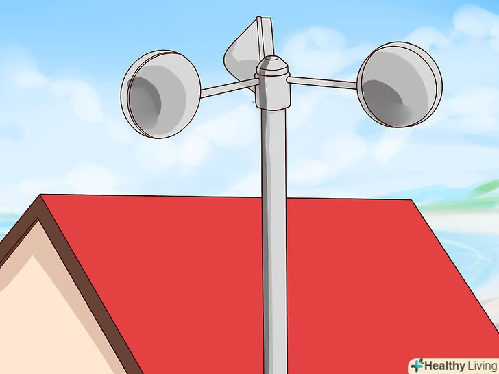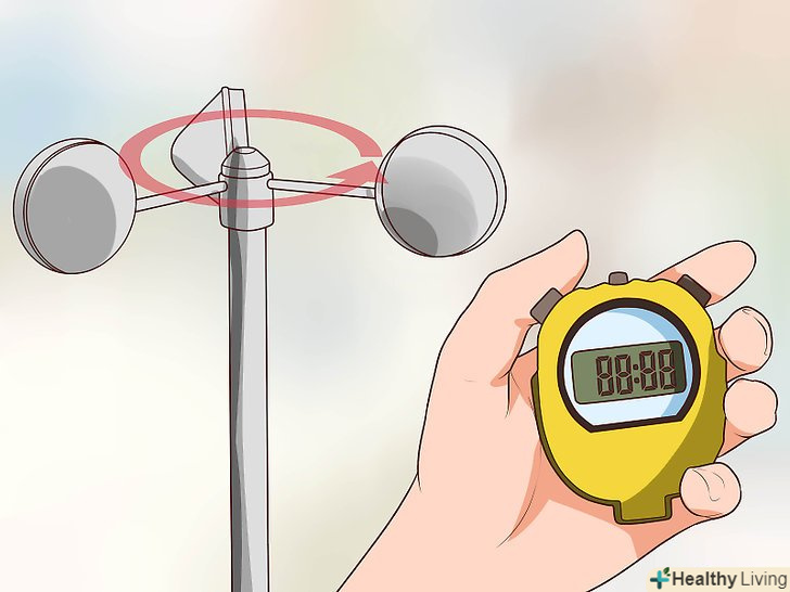 Дістаньте анемометр.Анемометр-це прилад для вимірювання швидкості вітру.[7] він складається з 3 або 4 чашок, які насаджені на спиці, що обертаються навколо центральної осі. Вітер дме в чашки і обертає спиці. Чим вище швидкість вітру, тим швидше обертаються чашки навколо осі.- Анемометр можна купити або зробити самостійно.