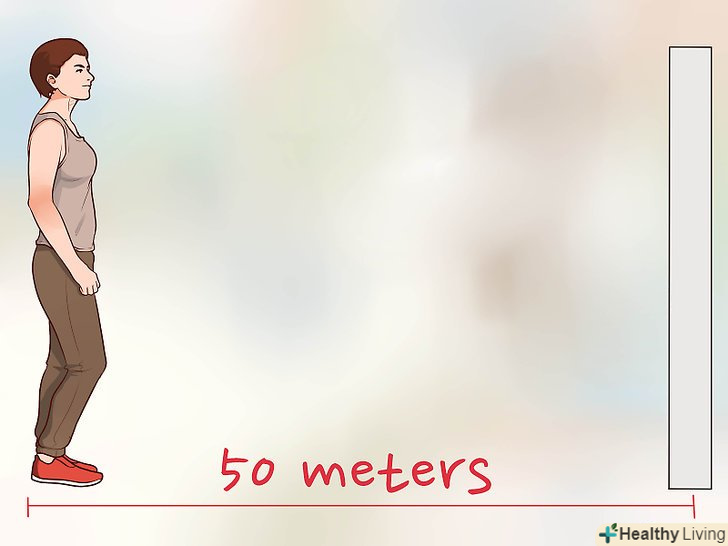 Відміряйте від стіни відстань не менше 50 метрів.така відстань необхідно для того, щоб вам вистачило часу для досить точних вимірювань. Так як звук спочатку подолає відстань від вас до стіни, а потім повернеться назад до вас, насправді відстань складе 100 метрів.- Визначте відстань за допомогою вимірювальної рулетки. Постарайтеся зробити це якомога точніше.