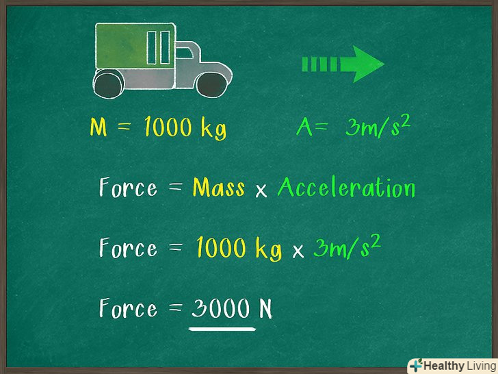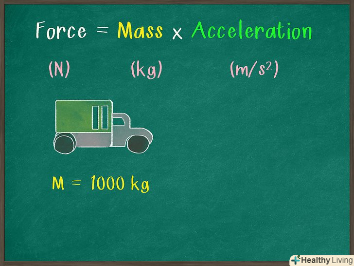 Виміряйте прискорення об'єкта.у фізиці прискорення визначається як зміна швидкості, тобто швидкість в певному напрямку в одиницю часу. Крім загальноприйнятого визначення прискорення як підвищення швидкості, воно також може мати на увазі уповільнення об'єкта або зміна напрямку його руху. Подібно вимірюванню швидкості за допомогою спідометра, прискорення можна виміряти акселерометром. Нехай прискорення вантажівки масою 1000 кг, з яким ми маємо справу, становить 3м/с2.- У метричній системі швидкість виражається в сантиметрах в секунду або в метрах в секунду, а прискорення – в сантиметрах в секунду за секунду (сантиметрах в секунду в квадраті) або в метрах в секунду за секунду (метрах в секунду в квадраті).