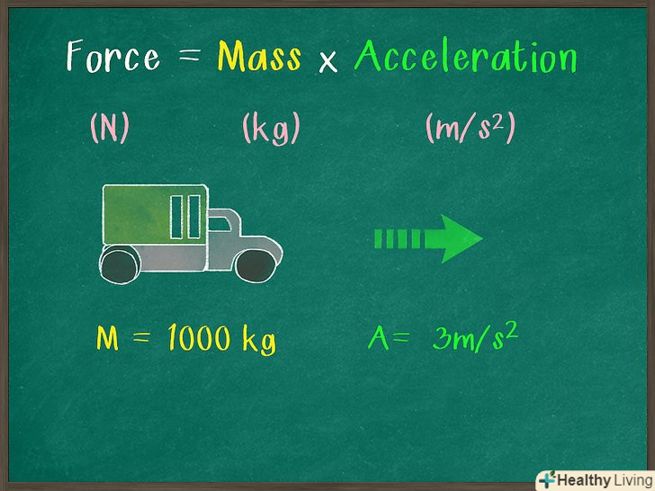 Розберіться в співвідношенні між силою, масою і прискоренням. Сила, що діє на об'єкт-це добуток його маси на прискорення. Це співвідношення можна представити у вигляді наступної формули: Сила = маса x прискорення.далі наведені інші положення, які потрібно мати на увазі при розрахунку сили:[1]- Стандартна одиниця виміру маси-кілограми (кг).
