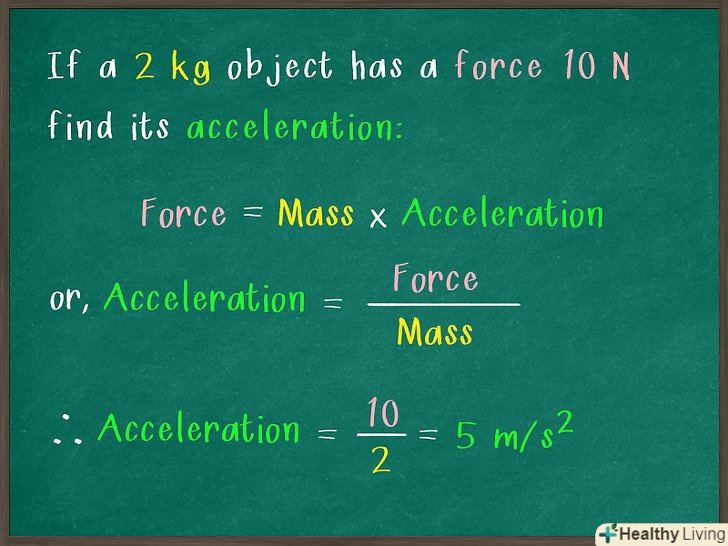Знайдіть прискорення, знаючи силу і масу.якщо ви знаєте силу і масу об'єкта, просто підставте їх в ту ж формулу, щоб знайти прискорення об'єкта. Ось як це зробити:- Сила= маса x прискорення